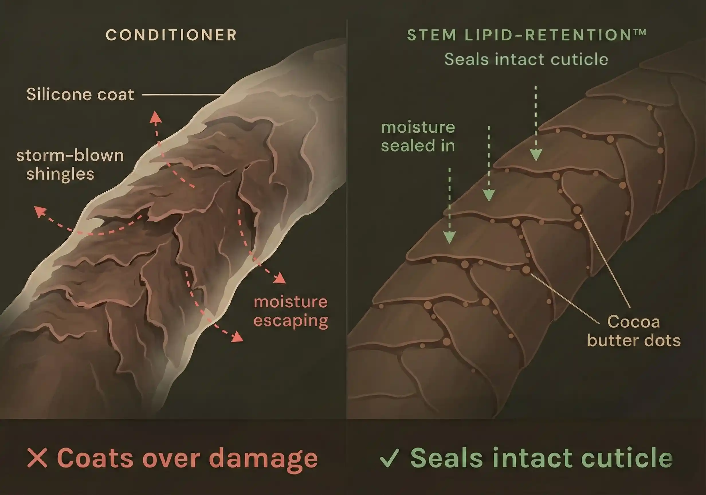 Traditional conditioners mask damage with synthetic films that eventually block moisture. Stem hydrates from within. Because Phase #1 preserved your cuticle, bio-active cocoa butter locks hydration inside the strand, leaving you with weightless, residue-free softness.